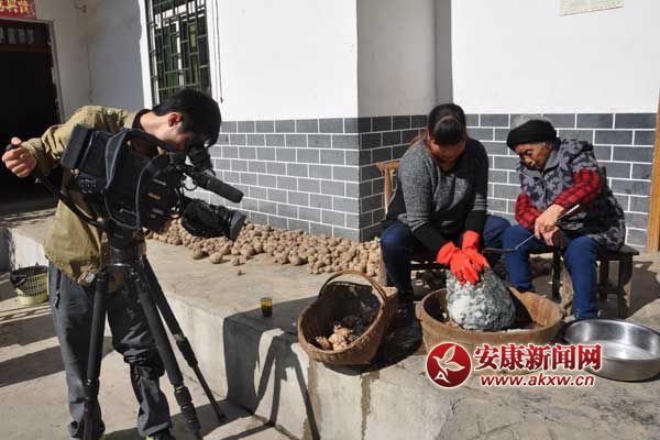 在魔芋大戶王永成家中,攝制組深入細(xì)致的拍攝了磨芋、煮、凝固、切面和浸水等魔芋豆腐制作的全過程。