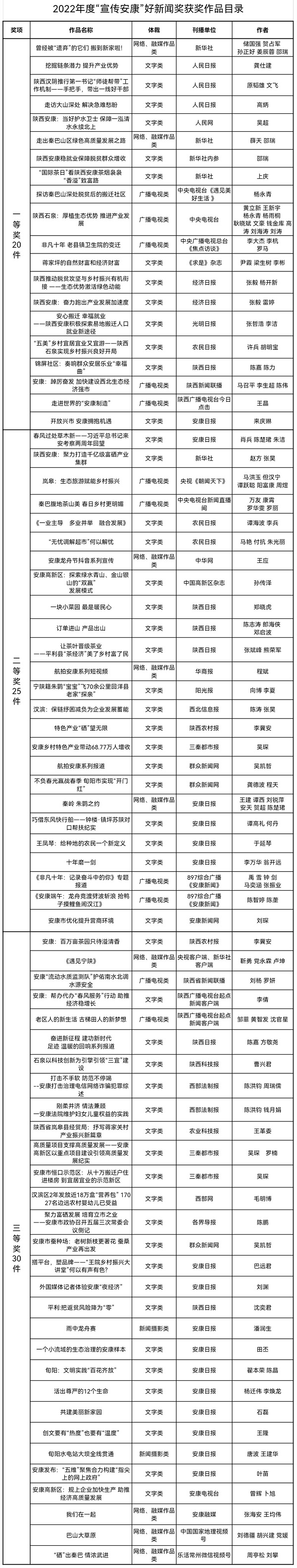 為充分發(fā)揮“宣傳安康”優(yōu)秀新聞作品示范作用,進(jìn)一步激勵廣大新聞工作者奮發(fā)有為,爭先創(chuàng)優(yōu)。經(jīng)過各申報(bào)單位推薦,市委宣傳部初審、復(fù)審并組織專家定評,評選出擬獲2022年度“宣傳安康”好新聞獎件75件,其中一等獎20件、二等獎25件、三等獎30件。