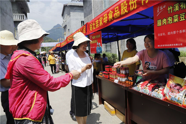 活動現(xiàn)場,鎮(zhèn)坪縣和竹溪縣各具特色的農副產(chǎn)品在竹葉村進行集中展銷,臘肉、茶葉、葵花油、百花蜜以及各種地方特色手工藝品吸引了往來游客紛紛品嘗與購買。