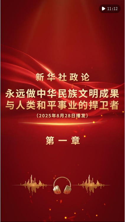 新華社8月28日播發(fā)《新華社政論|永遠做中華民族文明成果與人類和平事業(yè)的捍衛(wèi)者——寫在中國人民抗日戰(zhàn)爭暨世界反法西斯戰(zhàn)爭勝利80周年之際》。我們邀請誦讀嘉賓任志宏演播“第一章”。aLH安康新聞網