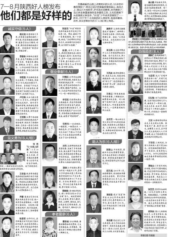 在最崎嶇的山路上點燃知識的火把,59歲的鄧惠民做到了;將自己設(shè)計的裝備安裝到高山、海島之上,保山川大地和平,護河流長空靜美,孫杰做到了;當父親全身重度燒傷生命垂危之際,義無反顧割下頭皮挽救父親生命,“90后”少年余天笠做到了……昨天,2017年7-8月陜西好人榜發(fā)布,包括鄧惠民、孫杰、余天笠等在內(nèi)的37人(組)榜上有名。8AD安康新聞網(wǎng)