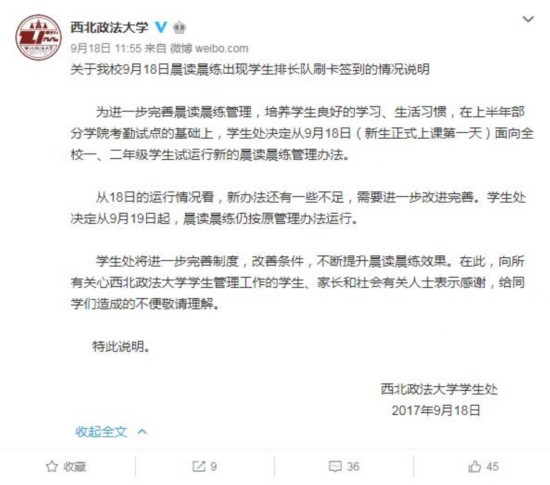 人民網(wǎng)北京9月19日電(馮粒)9月18日一早,西北政法大學(xué)校園內(nèi),學(xué)生們?yōu)槌孔x打卡排起了長長的隊伍,被學(xué)生們調(diào)侃為“晨讀五分鐘,打卡兩小時”。部分同學(xué)表示,幾千學(xué)生,就4個打卡機能用,“成功刷臉完成晨讀堪比春運搶火車票!”當(dāng)日中午,學(xué)校官方微博就此事發(fā)布通告稱,新的刷臉打卡的方式還存在不足,將于19日起恢復(fù)原管理辦法。