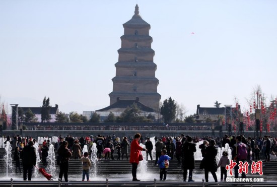 2月22日,民眾進(jìn)入大雁塔北廣場(chǎng)的噴泉區(qū)域游玩。當(dāng)日,陽(yáng)光明媚,西安大雁塔北廣場(chǎng)迎來(lái)了大量游客,人氣十足。中新社記者 張遠(yuǎn) 攝fdz安康新聞網(wǎng)