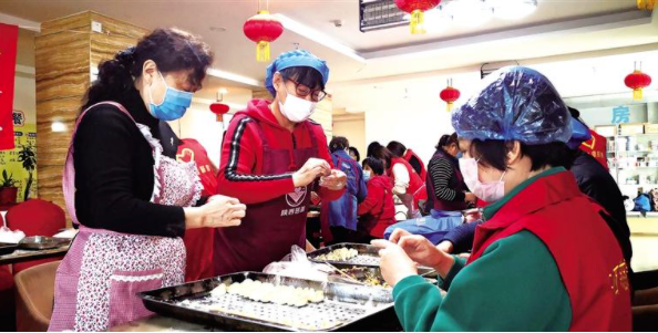 丁水彬孝老愛親志愿者服務隊隊員在西安碑林第三愛心護理院為老人包餃子。
