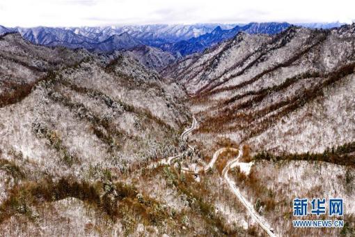 11月5日無人機(jī)拍攝的陜西省漢中市佛坪縣涼風(fēng)埡景區(qū)雪景。 當(dāng)日,秦嶺初雪,色彩斑斕的秋色在白雪映襯下,美如畫卷,置身其間,恍若進(jìn)入童話世界。 新華社記者陶……