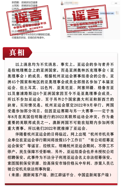 謠言6:八個(gè)國家宣布不參加杭州亞運(yùn)會(huì)?杭州因舉行亞運(yùn)會(huì)將于9月10日至25日放假?