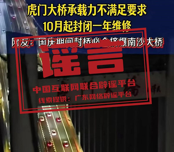 真相:近日,網(wǎng)絡(luò)上流傳“虎門大橋10月起封閉維修”的消息。經(jīng)東莞日報記者核實,該信息不準(zhǔn)確;㈤T大橋在國慶假期期間將正常通行且繼續(xù)實行免費政策。9月29日,廣東虎門大橋有限公司明確表示:虎門大橋在2026年春節(jié)前不會采取全封或半封措施,具體封閉時間及方案,目前均未確定。據(jù)悉,此前東莞市發(fā)展和改革局曾發(fā)布過相關(guān)評估前的公示,其中提到預(yù)計開工時間,但并非實際施工時間。(來源:“廣東省互聯(lián)網(wǎng)舉報中心”微信公眾號、東莞日報)